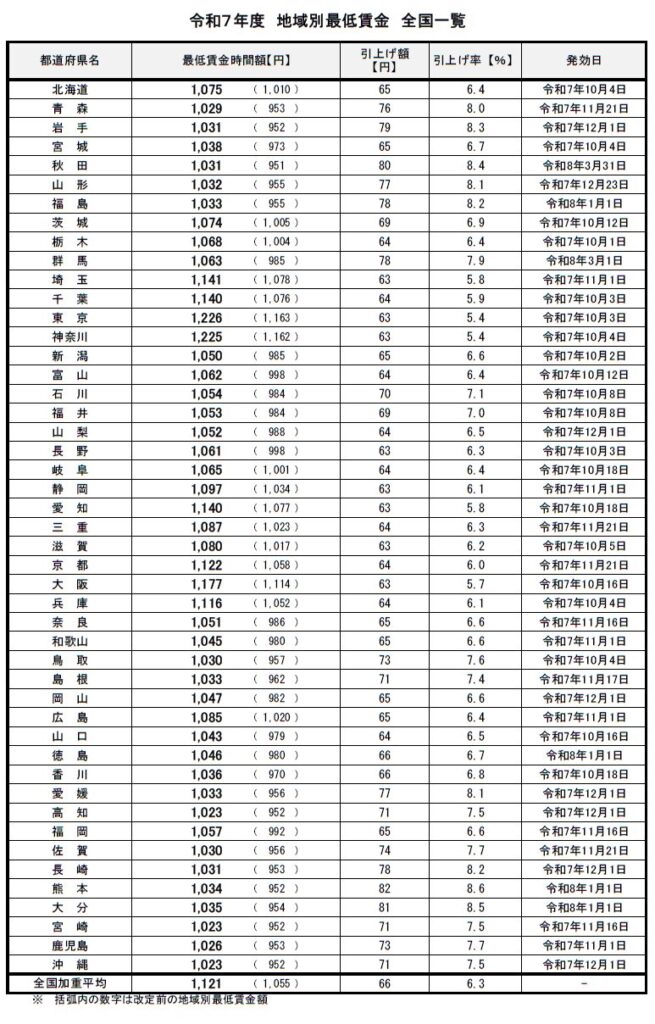 下の表は厚生労働省の最低賃金一覧、